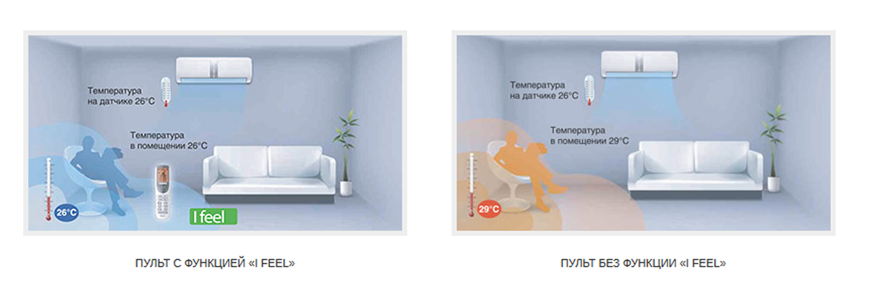 Кондиционер работает таким образом, чтобы достичь заданных параметров климатического комфорта по месту нахождения пульта ДУ.